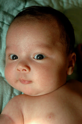 This photo session was rough. It was super dark outside, so I had a hard time getting it light enough to shoot in my livingroom. Also, even though Miles started smiling responsively this week- I could NOT get him to smile. The best one was the second one down, although it's blurry. Elly watched the shoot with Miles with a sad face because I told her she couldn't be in it this week (she came down with the stomach flu last night). So, the last shot is her sad face...it's still a beautiful face, though. Miles is amazing. He is sleeping more at night for me, so I am very grateful for that!